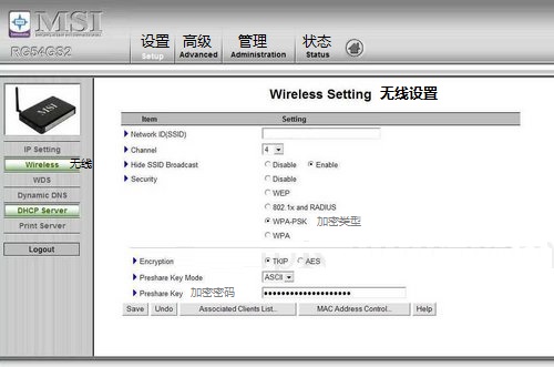 修改微星路由器无线密码的方法:按上述方法进入到路由器界面后,打开主菜单,选择【设置】选项,选择左侧【无线】选项。即可在右侧无线详细设置中设置你的无线加密。