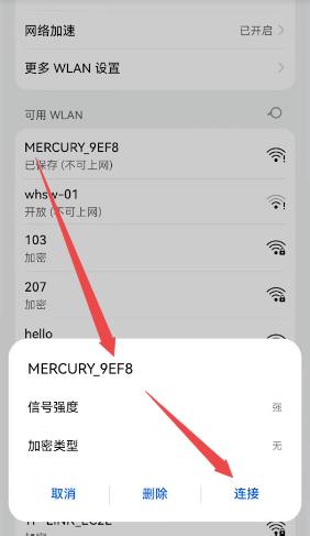 以你的机身上WIFI名称信息为准,打开手机设置,点开无线网络(WLAN),扫描后,发现MERCURY_开头名称进行连接。