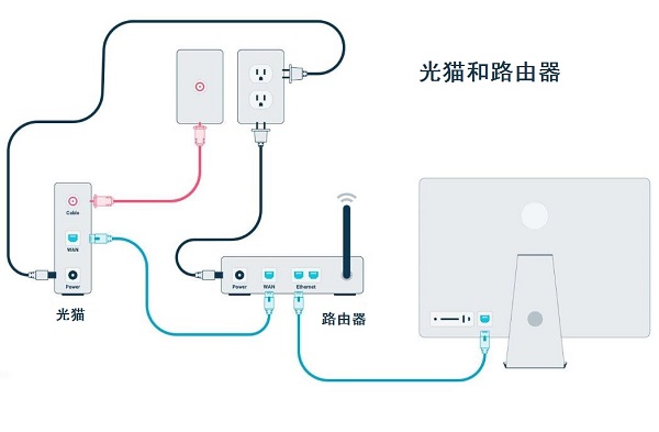 1;通过网线将路由器的WAN口(一般为黄色接口)连接到调制解调器或光猫等网络接入设备的LAN口(一般为白色接口)上。
