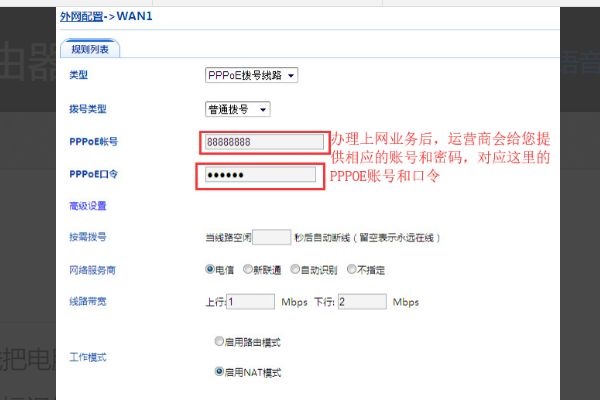 2、在外网配置,类型上我们选择PPPOE,输入办理上网时运营商提供的账号和密码,设置带宽后,点击保存,最后将外网线路接到WAN标识的接口上,接在此路由器上的电脑可以正常上网。