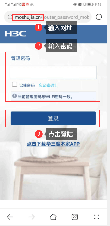 moshujia.cn或192.168.124.1都是是华三H3C系列路由器的登录入口地址;使用登录地址192.168.124.1即可成功登录到moshujia.cn设置界面,在登录设置之前我们需要对路由器和设备做好以下准备; 登录设置: 手机和电脑登录路由器web管理界面的操作基本相同。