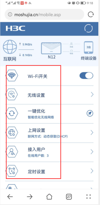 3.点击无线设置,打开之后可是查看或者设置修改h3c无线路由器的WiFi密码和名称