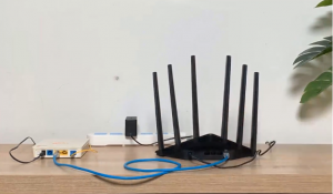 1:路由器线路连接,我们把电源适配器连接上,然后把网线连接上路由器任意千兆网口,另一端连接家中的光猫;
