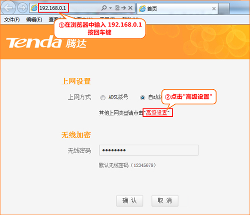 1、在浏览器中输入:192.168.0.1 按回车键,在跳转的页面中点击“高级设置”