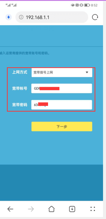 输入宽带账号和宽带密码,点击下一步。