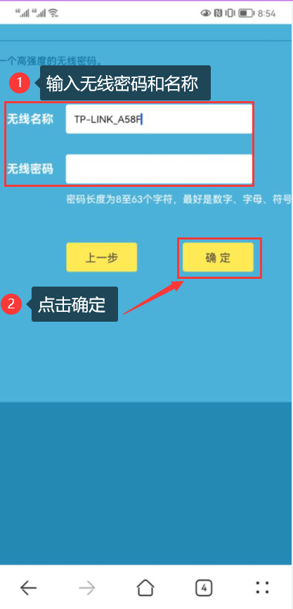 第七步:创建无线路由器的WiFi密码和WiFi名称,然后点击确定,进入下一步。