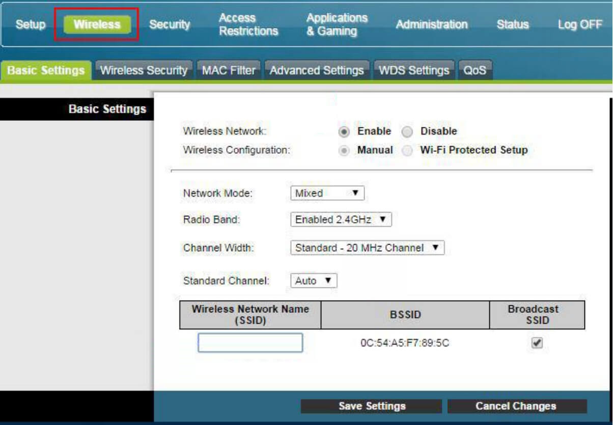 3. 选择无线>基本设置> 2.4G。要更改 5 GHz 网络,请转到 5G 设置。