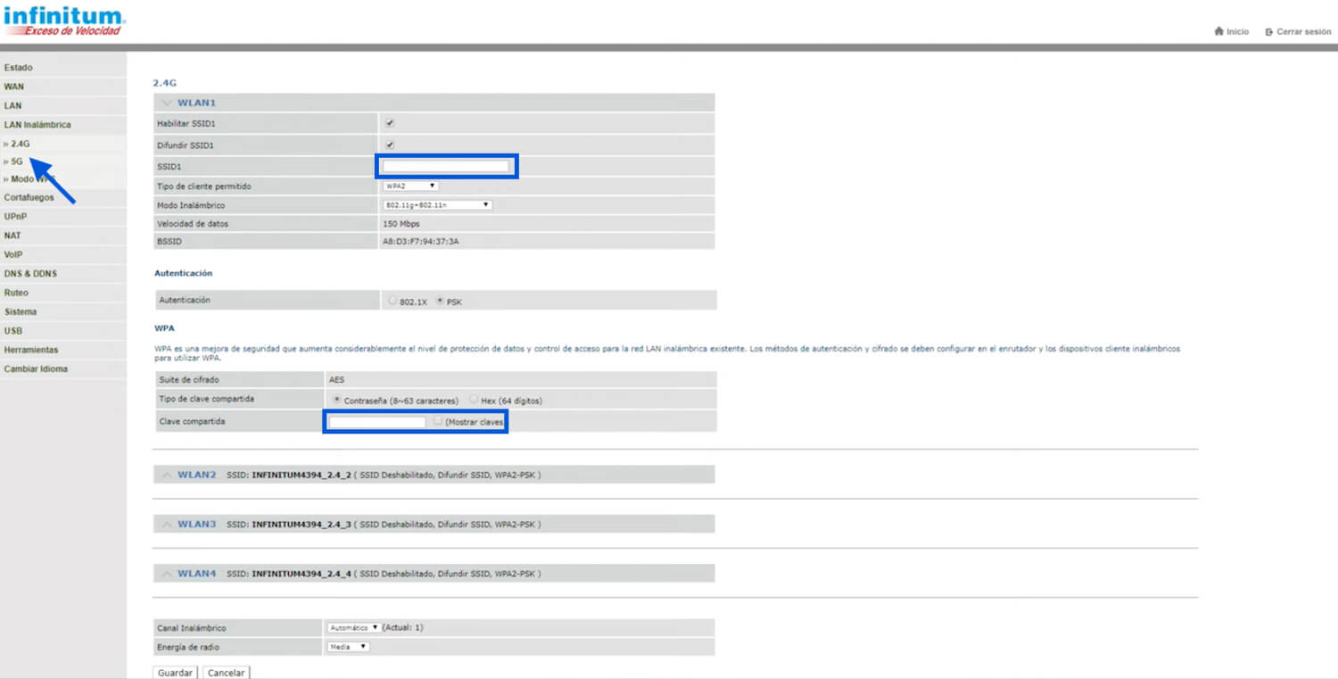 1. 打开 LAN inalámbrica 并选择 2.4G。要更改 5GHz 设置,请打开 5G 设置。