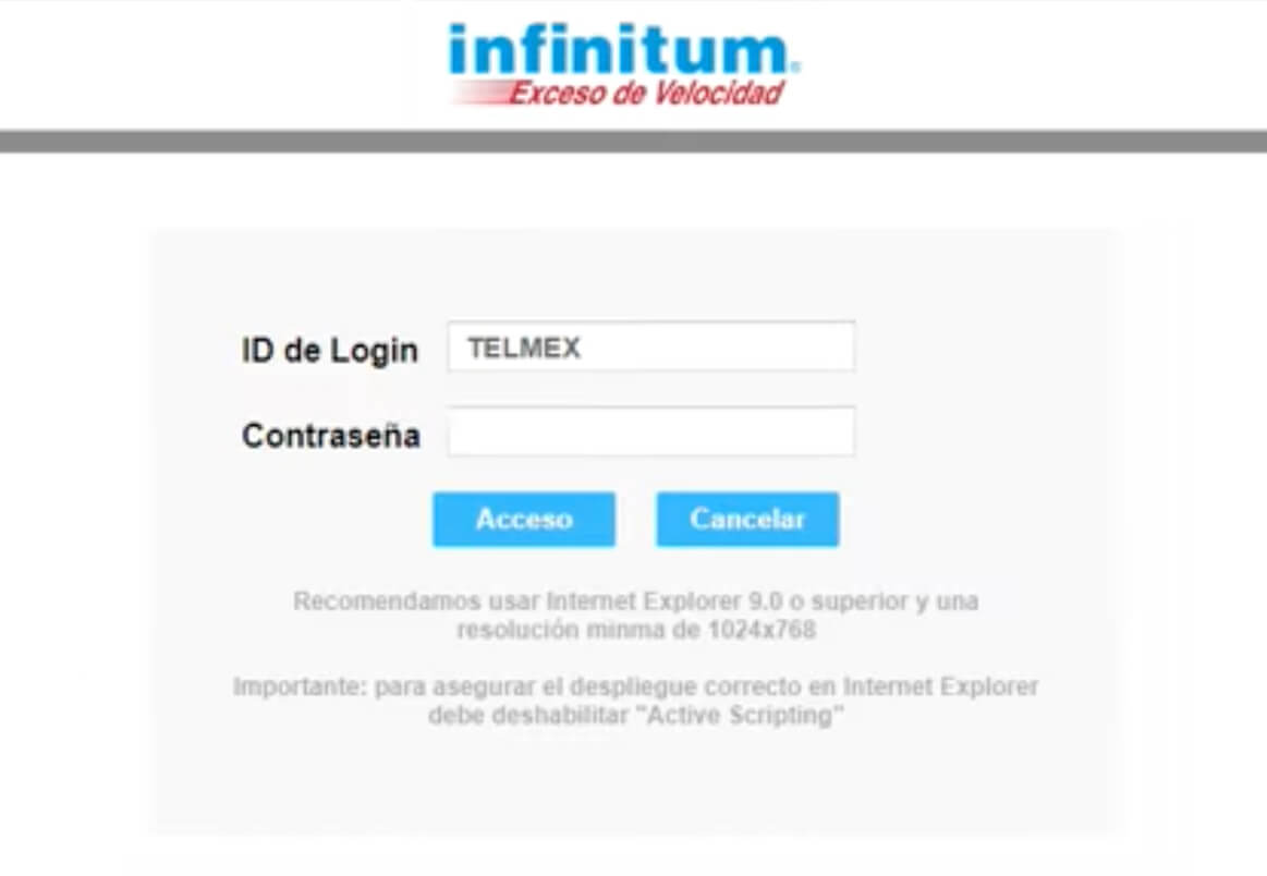 2. 输入用户名:TELMEX 和密码,然后单击登录。Contraseña (WPA) 打印在路由器上。