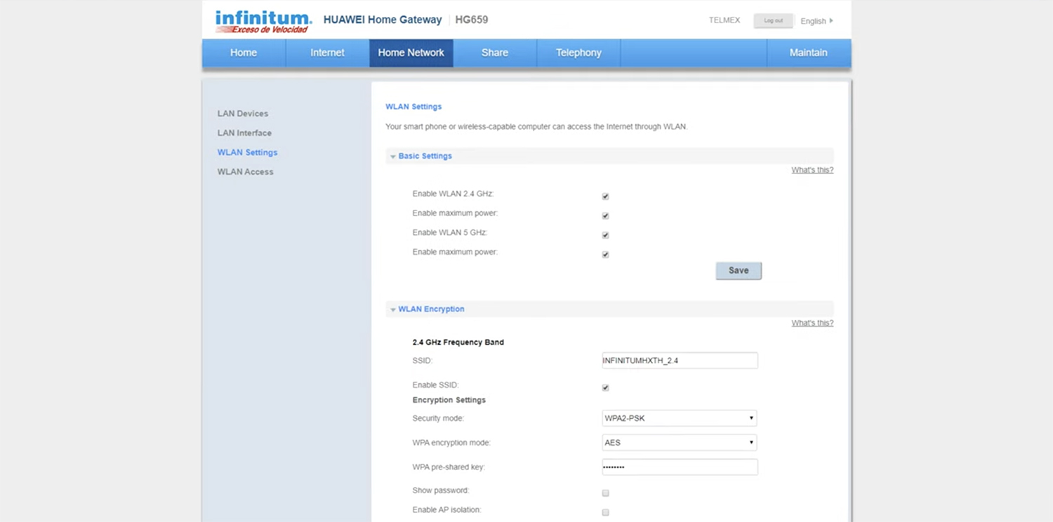 Telmex 路由器接口允许您 http://192.168.1.254 更改 WiFi 密码、网络名称 (SSID) 和默认 Telmex Infinitum 设置。