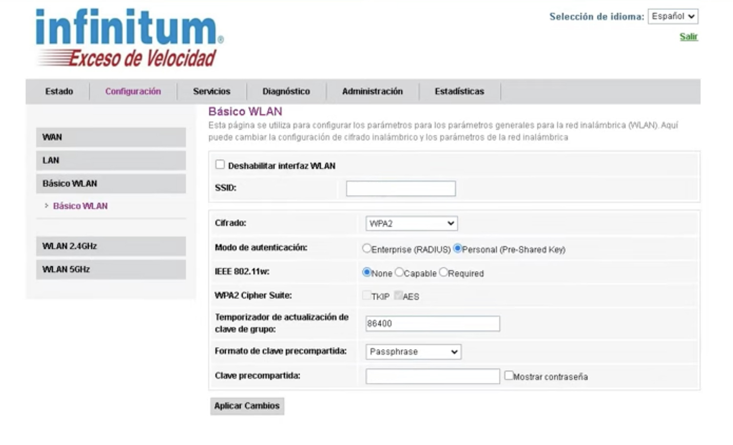 1. 从菜单中打开 Configuración 并选择 Básico WLAN。