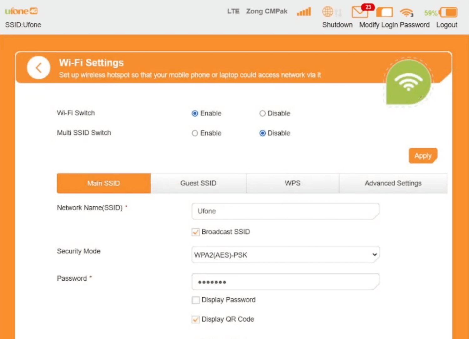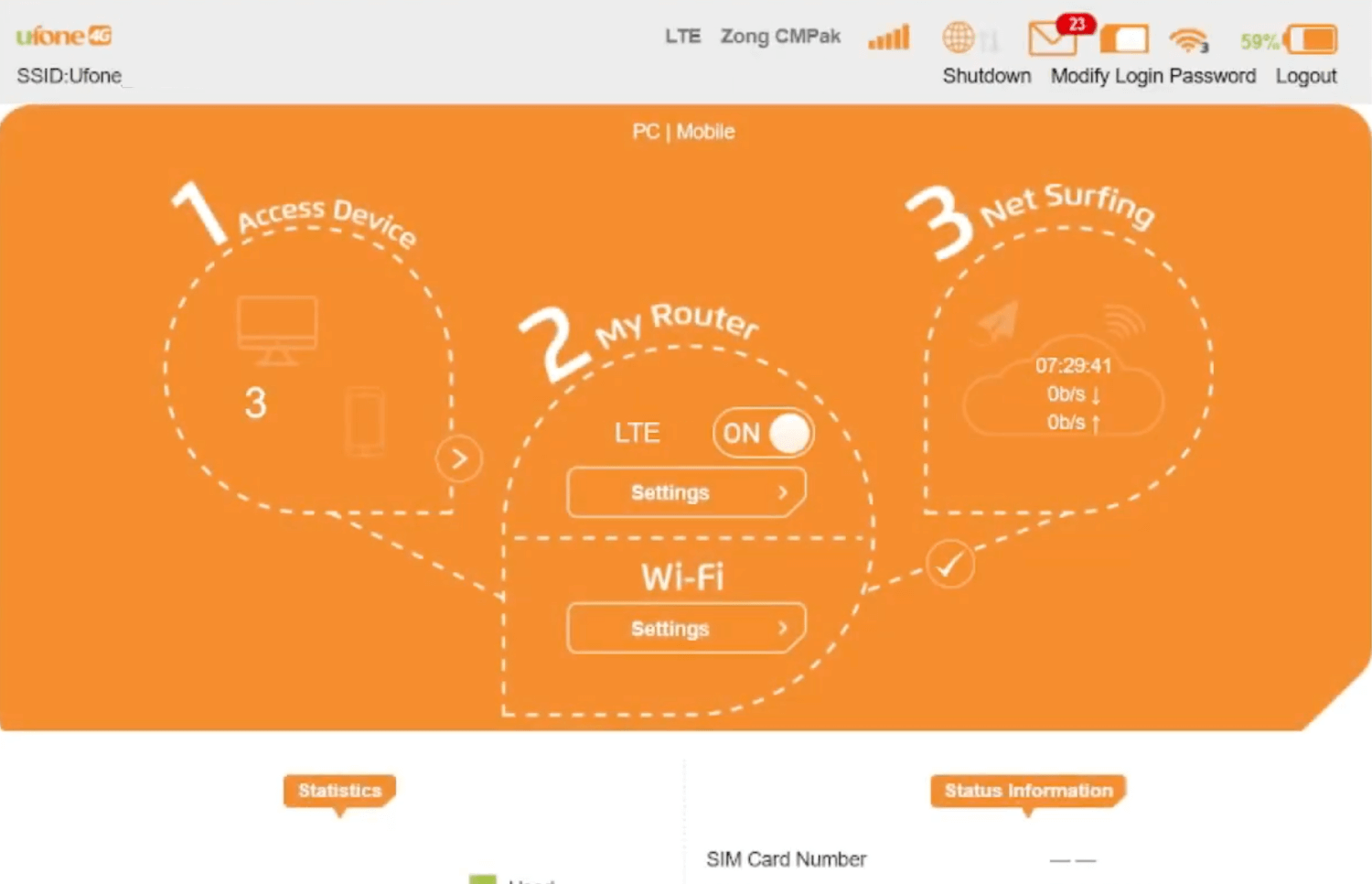 Ufone 设备管理器网站允许您更改 WiFi 密码、网络名称和默认 Ufone 4G Blaze 设置 http://192.168.1.1。