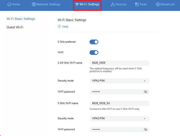 4. 在 2.4/5 GHz Wi-Fi 名称字段中输入 Wi-Fi 网络名称。