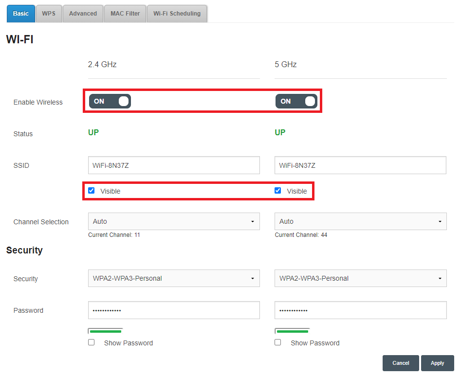 3. 选择 Wi-Fi 2.4GHz 或 Wi-Fi 5GHz 面板上的齿轮/齿轮图标。