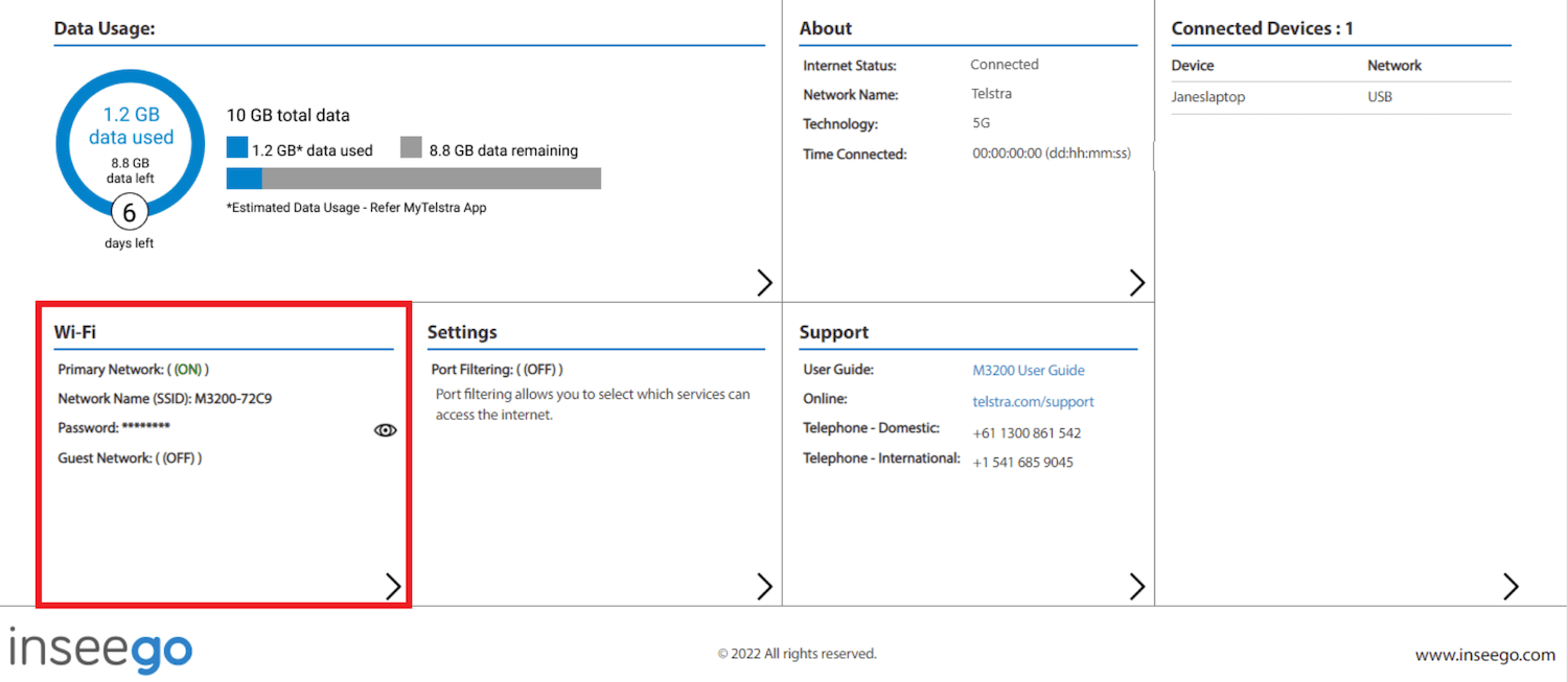Inseego MiFi 管理 Web UI 允许您更改 WiFi 密码、网络名称 (SSID) 和默认 Inseego 移动热点设置 http://192.168.1.1。