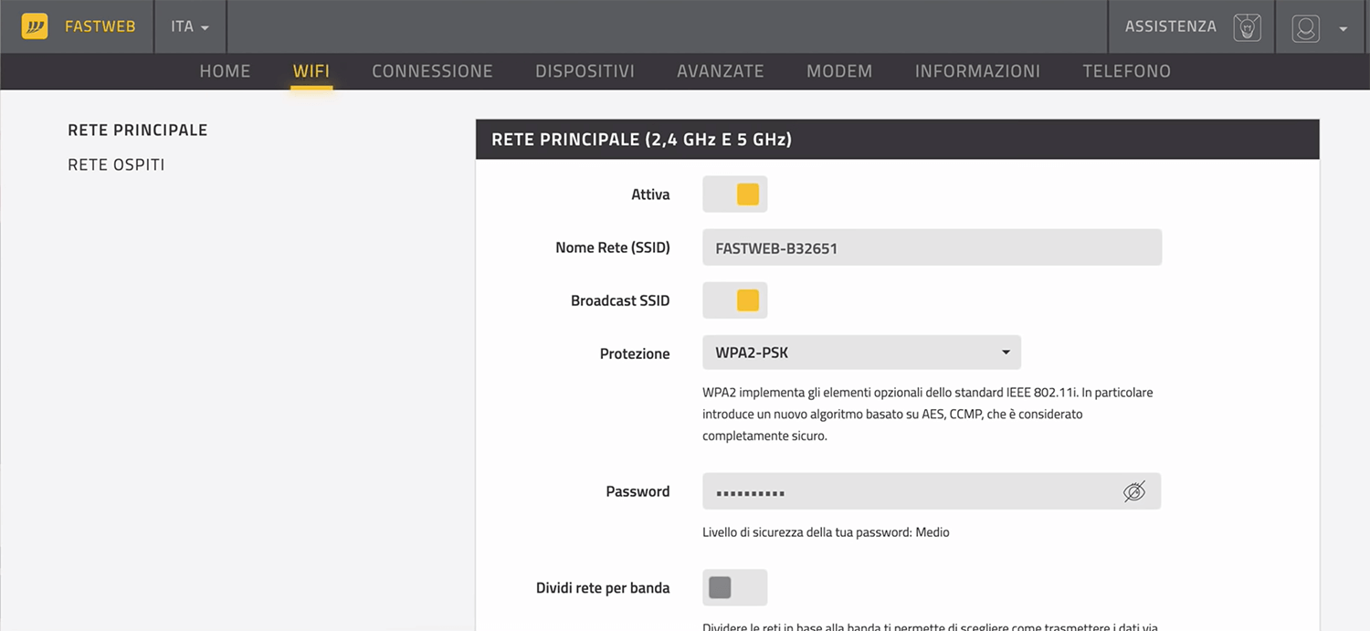 FASTGate 路由器接口允许您在 http://myfastgate 更改 WiFi 密码、网络名称 (SSID) 和默认的 Fastweb FASTGate 设置。