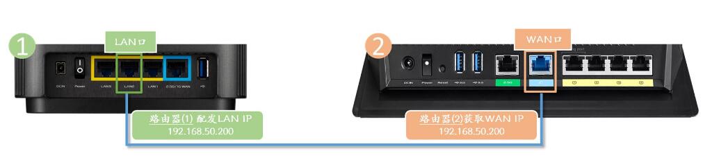 2. 用网线连接华硕路由器(1)的LAN接口和华硕路由器(2)的WAN接口。