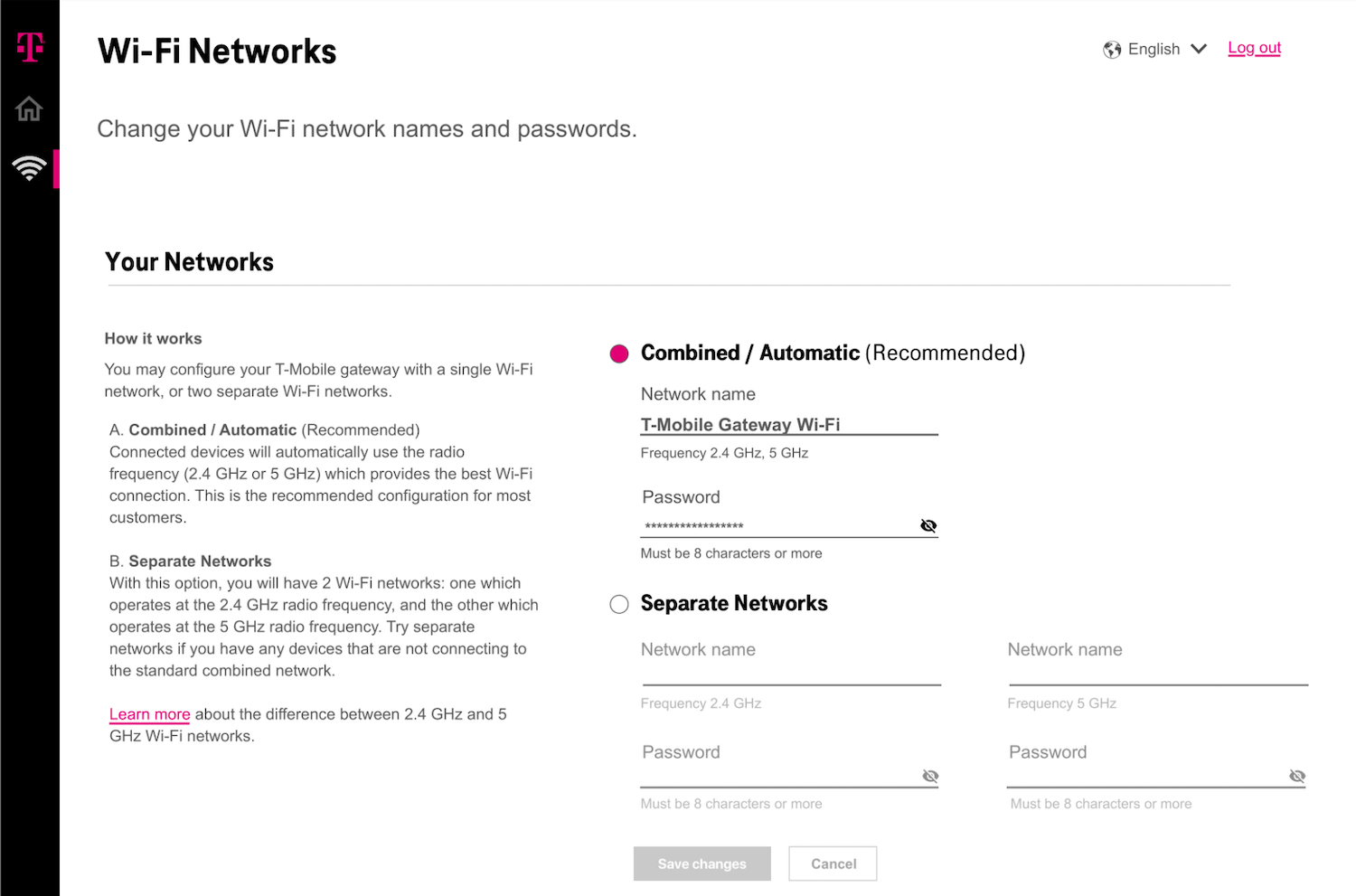 T-Mobile Web 用户界面允许您更改 Wi-Fi 密码、网络名称 (SSID) 和默认的 T-Mobile 网关或路由器设置。