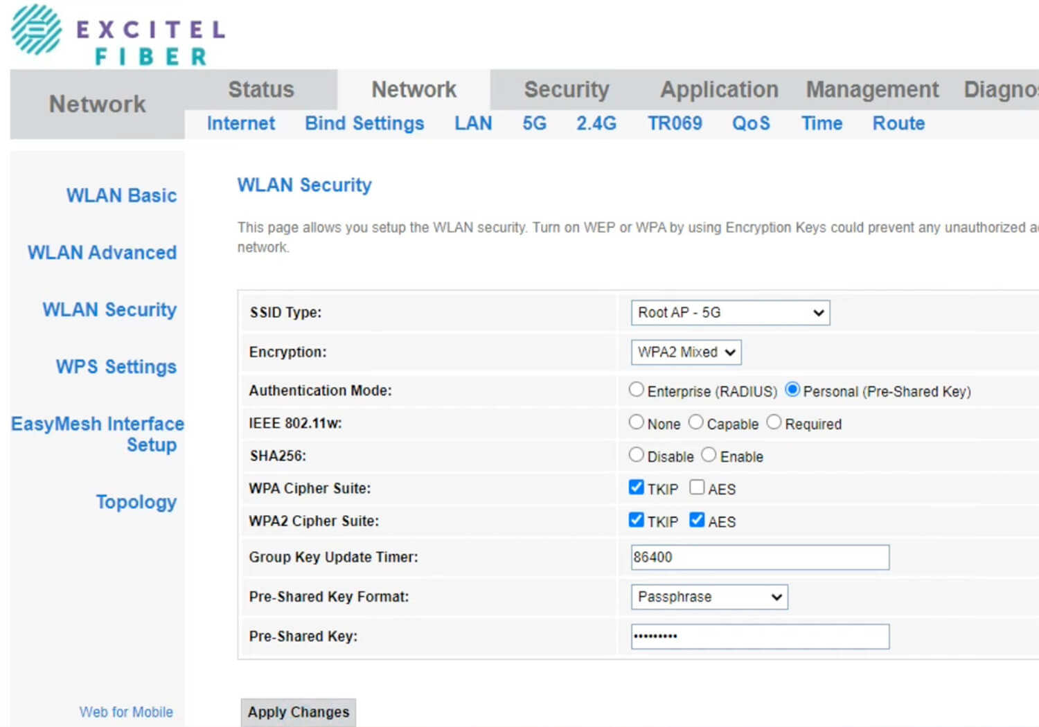 5. 在“预共享密钥”字段中输入 Wi-Fi 密码,然后单击“应用更改”。