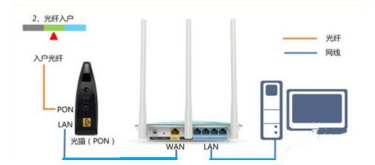 如果你家里的宽带,是通过光纤接入上网;那么运营商会提供一个光猫给你。自己在安装无线路由器的时候,按照下面的方式进行接线。