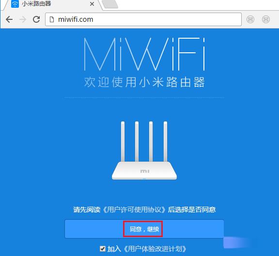 1、在电脑的浏览器中输入:miwifi.com ,就可以打开小米路由器3的设置界面 ——》 点击页面中的 同意、继续 按钮,如下图所示。
