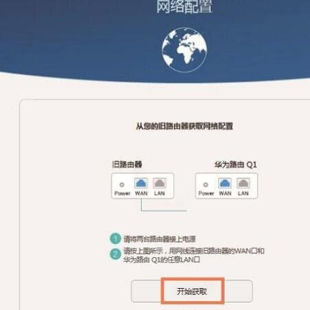 先把旧路由器的WAN接口,连接华为路由Q1的LAN接口,然后点击“开始获取”