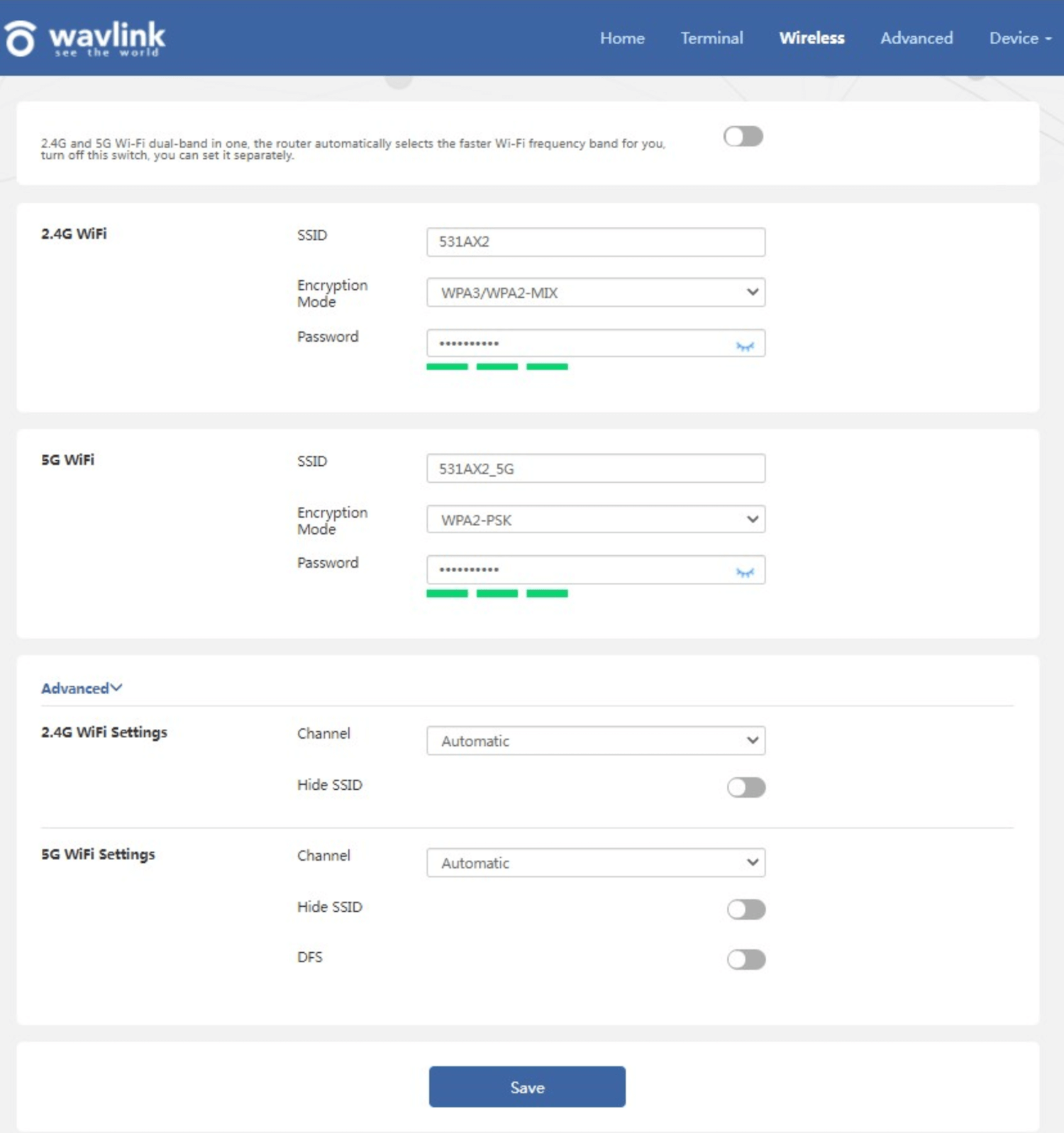 结合 2.4GHz 和 5GHz 频段,在更快的 Wi-Fi 频段之间自动切换。如果开关关闭,您可以分别配置 2.4G 和 5G WiFi。