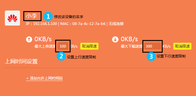 点击终端名字,修改为常用名便于管理。然后点击限速,分别限制上下行速率的最大值。