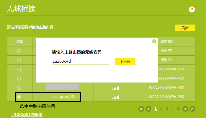 选择扫描到的主路由器信号,并输入主路由器的无线密码,点击下一步: