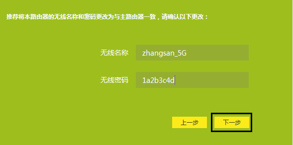 设置副路由器2.4G信号的无线网络名称和无线密码,点击下一步,如下: