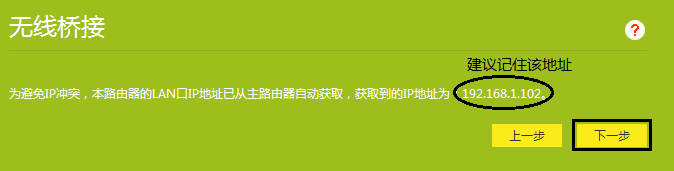 主路由器会给副路由器分配一个IP地址,用于后续管理路由器,建议记下该IP地址,点击下一步。
