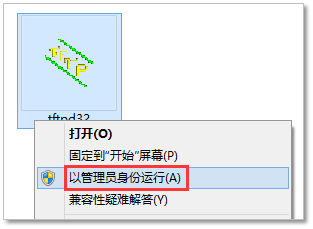 Vista/Windows 7/8/8.1/10等操作系统,建议不要双击打开TFTP服务器,而是鼠标右击选择“以管理员身份运行”,如下图: