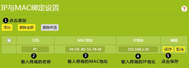 如果终端未连接路由器,需要手动添加终端的IP地址和MAC地址。在IP与MAC绑定设置界面,点击添加,输入终端的MAC地址、IP地址,点击保存即可。如下图: