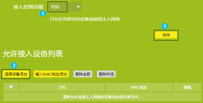 注意:接入控制功能选择开启后,才能添加设备的MAC地址。