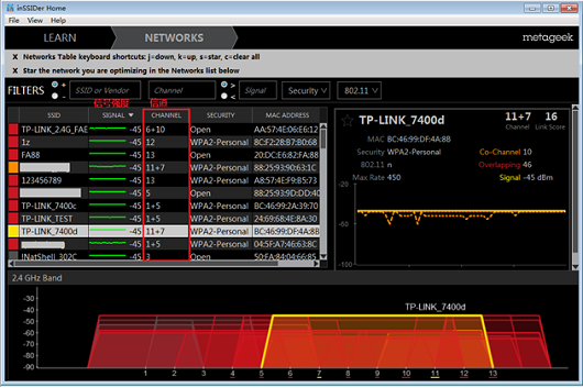 从扫描结果中可以查看到周围环境中其他无线信号工作的信道以及信号强度,如下图: