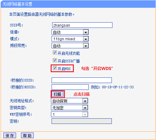 部分无线路由器支持WDS功能,在路由器界面开启WDS功能,扫描周围无线信号。