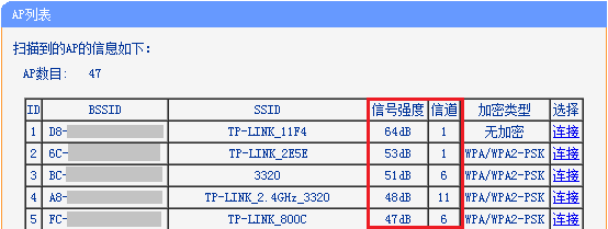 注意:信号强度以负数表示,其绝对值越小,表示信号越强。例如扫描的A信号强度为-45,B信号为-70,则A信号强于B信号。