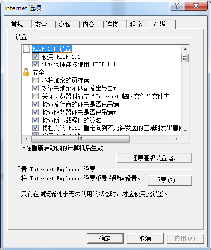 如果第一步没有解决问题,请依次点击工具>> Internet选项,在高级选项中,点击重置,如下图: