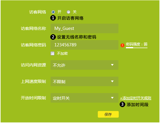 开启访客网络,设置准备提供给访客的的无线信号名称和密码,以及设置相应的权限、速率。开放时间限制选择定时开关,如下图:
