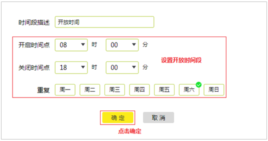 点击添加定时开关规则,设置访客网络需要开放的时间段,如下图: