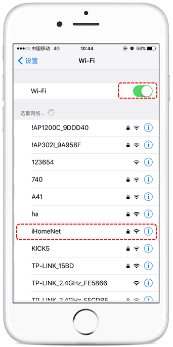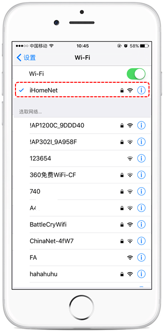 首先,我们介绍iPhone连接TP-LINK无线(Wi-Fi)信号的方法,重点是介绍连接信号过程中需要注意的事项。请您务必确认路由器发出的无线信号名称和无线密码,本文使用无线信号名称iHomeNet(密码1a2b3c4d)举例。请按照下文操作: