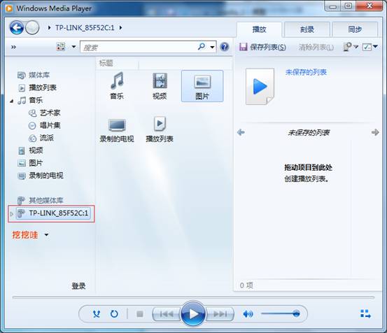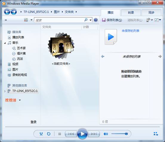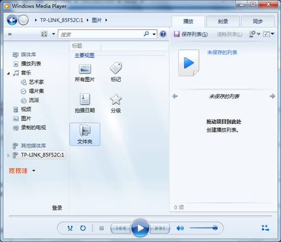 Windows Media Player会自动搜索到局域网中的媒体服务器,如上图红框标注所示为TL-WR2543N开启的媒体服务器。选中该服务器,并双击图片菜单,如下图所示。