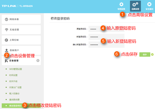 登录路由器管理界面,点击“高级设置”>>“设备管理”>>“修改登陆密码“,依次输入原登录密码并设置新的登录密码。点击“保存”。