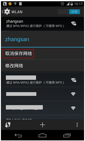 设置方法:在WLAN设置界面,长按需要删除的无线信号,在弹出的对话框选择取消保存网络。如下图所示: