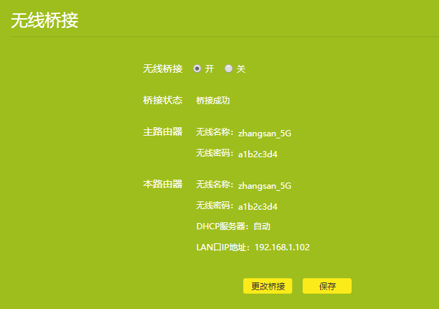 再次进入“应用管理>无线桥接”,可以看到桥接状态为“桥接成功”,说明WDS设置成功,如下: