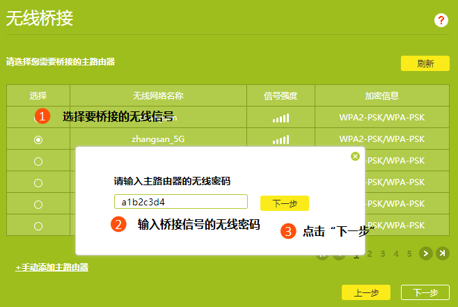 选择扫描到的主路由器信号,并输入主路由器的无线密码。如果主路由器支持2.4G和5G频段,建议选择5G信号。这里我们需要桥接的无线信号是:zhangsan_5G,输入无线密码之后点击“下一步”: