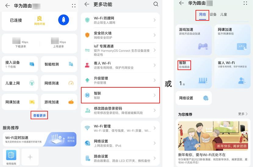 • 建议使用更高配置、性能更好的华为路由器做主路由。华为路由 Q 系列电力线版本与本知识内适配中的其他华为路由器智联时只能作为主路由,套装内的子路由不支持作为主路由。