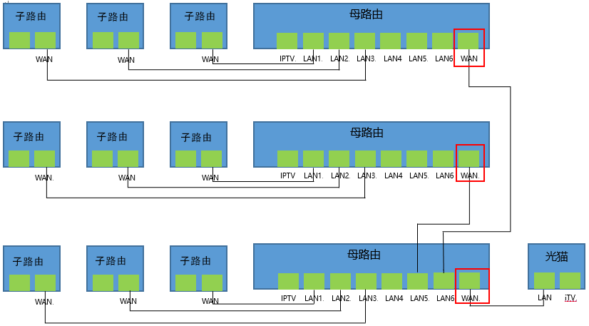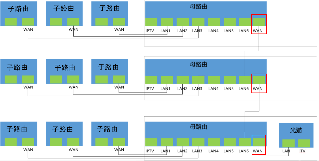 多套组网推荐使用光猫 — 母 1 — 母 2 + 母 3 方式组网(二级组网),若特殊场景无法实现该组网方式,可选择光猫 — 母 1 — 母 2— 母 3 组网方式(三级组网),不支持光猫 — 母 1— 母 2 — 母 3 — 母 4(四级组网)。下列组网示意图均以 8 口母路由+ 3 台子路由为例,其他情况请以此类推。