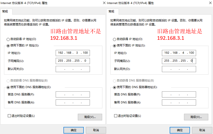 o 若其他品牌路由器的管理地址是 192.168.3.1,IP 地址设置为 192.168.4.X(X 可设为 2~254)。