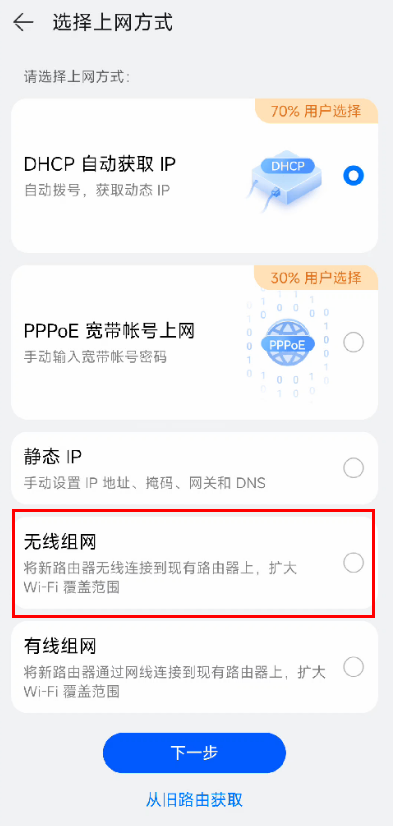 5. 若页面提示检测到网线未连接,无需连接网线,继续跟随向导直至选择上网方式页面,点击 无线组网,点击下一步。